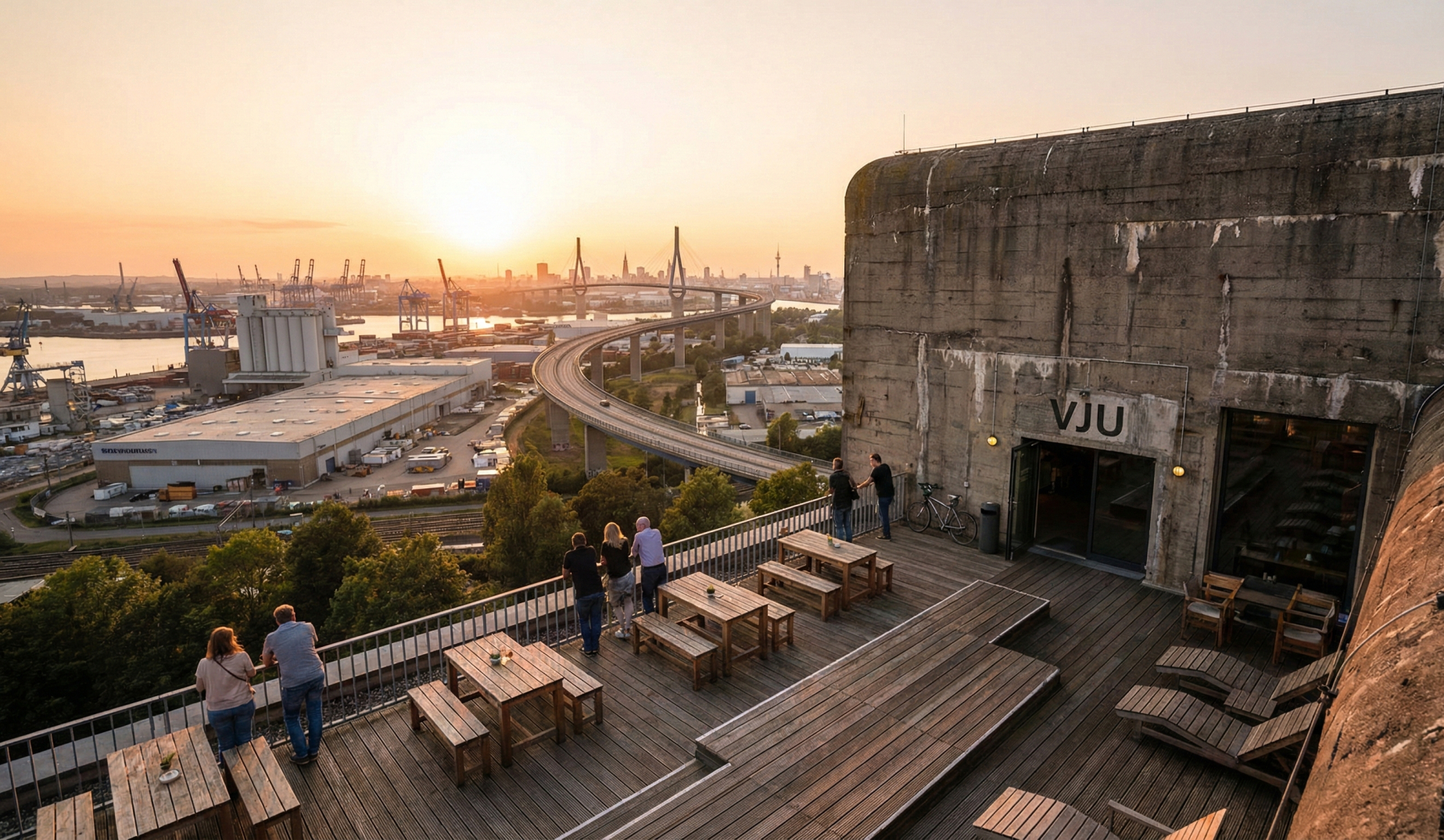 In 30 Metern Höhe, oberhalb der meterdicken Betonwände, erwartet den Besucher eine umlaufende Terrasse, die das vielleicht spektakulärste und kompromissloseste 360-Grad-Panorama der gesamten Metropolregion bietet. Man schreitet auf Holzplanken um das Gebäude herum und erlebt Hamburg in seiner ganzen industriellen und urbanen Dimension: Im Süden dominieren die gigantischen, fast schon dystopisch wirkenden Hafenanlagen und Containerterminals, man erblickt die elegant geschwungene Köhlbrandbrücke in ihrer vollen Pracht und schaut im Norden über den Fluss hinweg auf die kleine, filigran wirkende Skyline der Hamburger Innenstadt. Die Atmosphäre im VJU, das tagsüber als gemütliches Café mit hervorragendem Kuchen fungiert und an ausgewählten Abenden zur Bar wird, ist geprägt von einer rauen, unprätentiösen Industrieromantik. Bequeme, moderne Loungemöbel bilden einen reizvollen Kontrast zum rohen Sichtbeton. Die Getränkekarte ist ehrlich, bodenständig und absolut fair bepreist, mit einer feinen Auswahl an guten Weinen, regionalen Bieren und klassischen Longdrinks. Hier steht nicht die mixologische Avantgarde im Mittelpunkt, sondern das gewaltige, schier unendliche Panorama, das ganz besonders in den dramatischen Momenten des Sonnenuntergangs, wenn das Licht über dem endlosen Hafenbecken bricht, zu einer unvergesslichen Erfahrung wird.