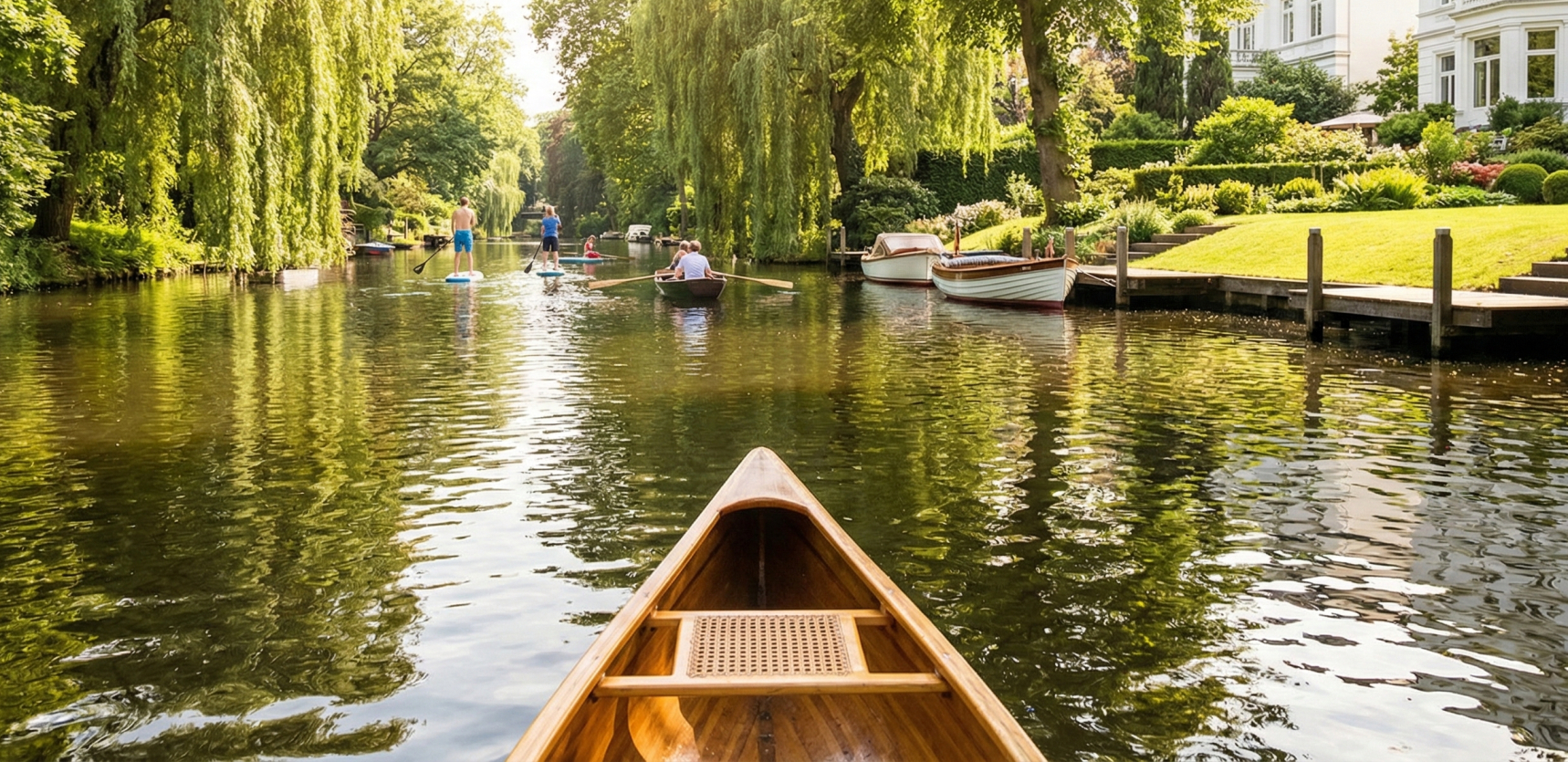 Das absolut bestimmende Element dieser Viertel ist jedoch das Wasser. Hamburg rühmt sich oft, mehr Brücken zu haben als Venedig und Amsterdam zusammen, und nirgendwo in der Stadt wird dieser wasserreiche Charakter so erlebbar wie in Winterhude und Eppendorf. Ein engmaschiges Netz aus idyllischen Kanälen – wie der Osterbekkanal, der Goldbekkanal oder der Leinpfadkanal – durchzieht die Viertel und verbindet sie direkt mit der Außenalster, dem gigantischen Binnensee mitten im Herzen der Stadt. Das Leben verlagert sich hier besonders in den Sommermonaten fast vollständig aufs Wasser. Die Gärten vieler Villen reichen direkt bis an die Kanäle und verfügen über eigene Bootsstege. Wer diese Viertel wirklich entdecken will, darf dies nicht nur zu Fuß tun. Das Mieten eines Kanus oder eines Stand-Up-Paddle-Boards (SUP) ist hier Pflicht. Wenn man lautlos über das Wasser gleitet, die Trauerweiden ihre Äste in die Kanäle tauchen und man die prächtigen Rückseiten der Grundstücke bewundert, offenbart sich eine Stille und Schönheit, die in einer Millionenmetropole absolut surreal wirkt.