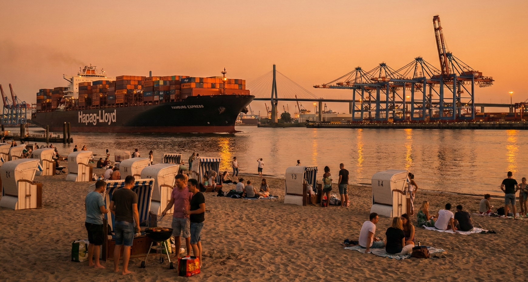 Wenn Berliner vom Wannsee schwärmen und Münchner von der Isar, dann lächelt der Hamburger nur milde und fährt an die Elbe. Der Elbstrand ist einzigartig in Europa. Wo sonst kann man im feinen Sand liegen, die Füße ins Wasser strecken und gleichzeitig gigantischen Containerschiffen dabei zusehen, wie sie sich ihren Weg in den Hafen bahnen oder aufs offene Meer hinausziehen? Dieser Kontrast aus industrieller Hafenromantik – mit den Kränen des Burchardkai am Horizont und dem geschäftigen Treiben der Schlepper – und purem Urlaubsfeeling im Sand ist das, was den Hamburger Sommer ausmacht.