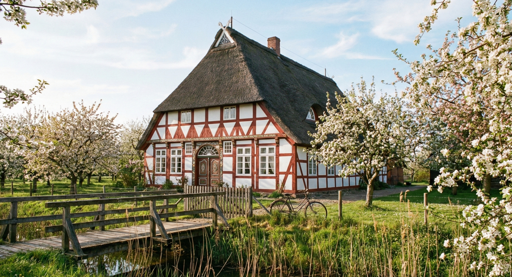 Das Alte Land ist eine von Menschenhand geschaffene Kulturlandschaft, die dem Wasser abgetrotzt wurde. Holländische Siedler begannen im 12. Jahrhundert damit, das sumpfige Elbufer einzudeichen und urbar zu machen. Ihr Erbe ist bis heute sichtbar – nicht nur in den unzähligen Gräben ("Wettern") und Deichen, sondern auch in der einzigartigen Architektur. Die Altländer Fachhallenhäuser sind Ikonen der Region. Diese riesigen, oft reetgedeckten Bauernhäuser sind wahre Prachtbauten. Ihre Fachwerkgiebel sind kunstvoll gemauert, oft mit weißen Mustern im roten Stein, und die "Brauttüren" sind farbenfroh und reich verziert. Sie zeugen vom Wohlstand der Obstbauern, der über Jahrhunderte gewachsen ist.